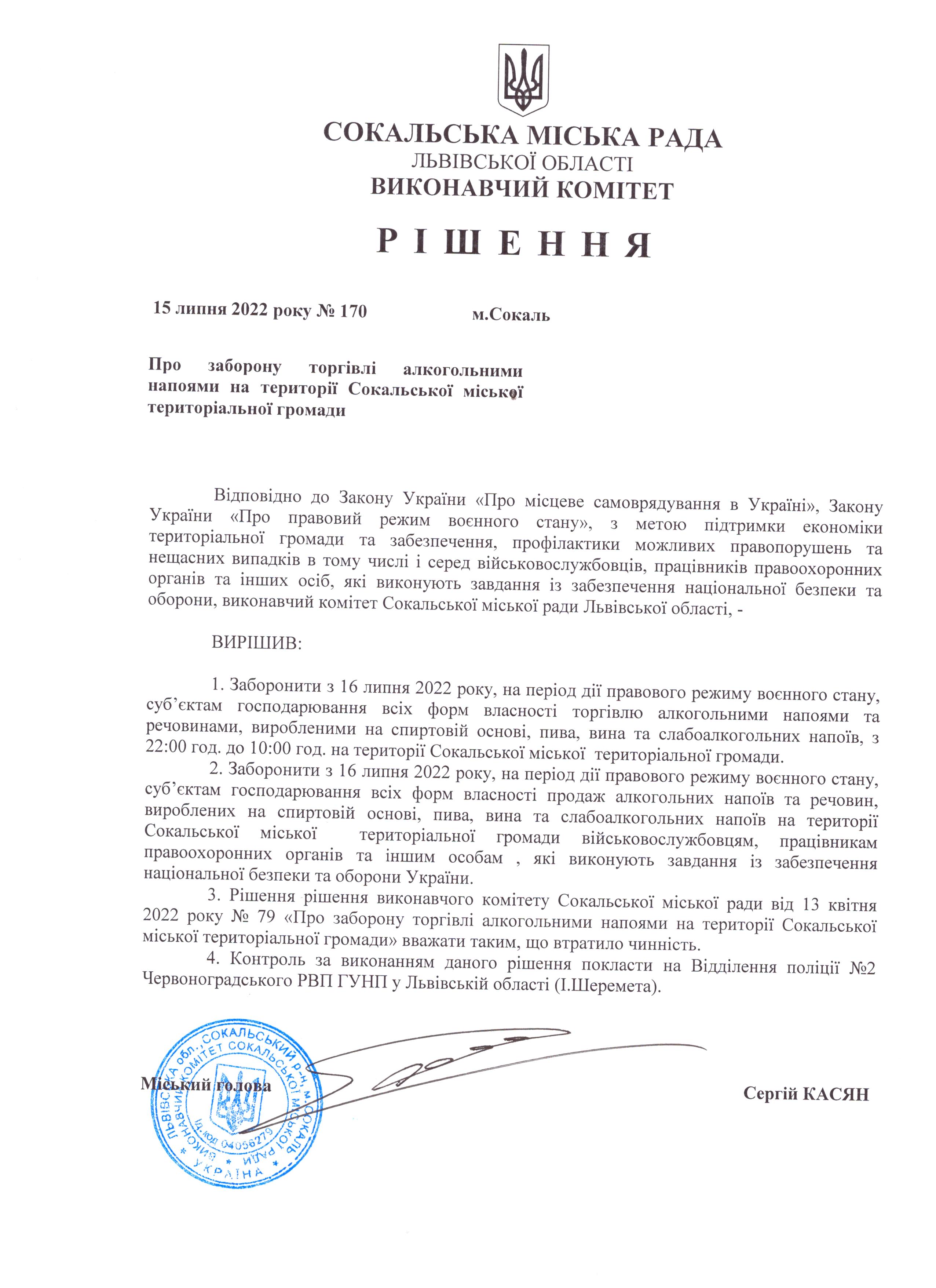 Рішення виконавчого комітету Про заборону торгівлі алкогольними напоями на території Сокальської ОТГ