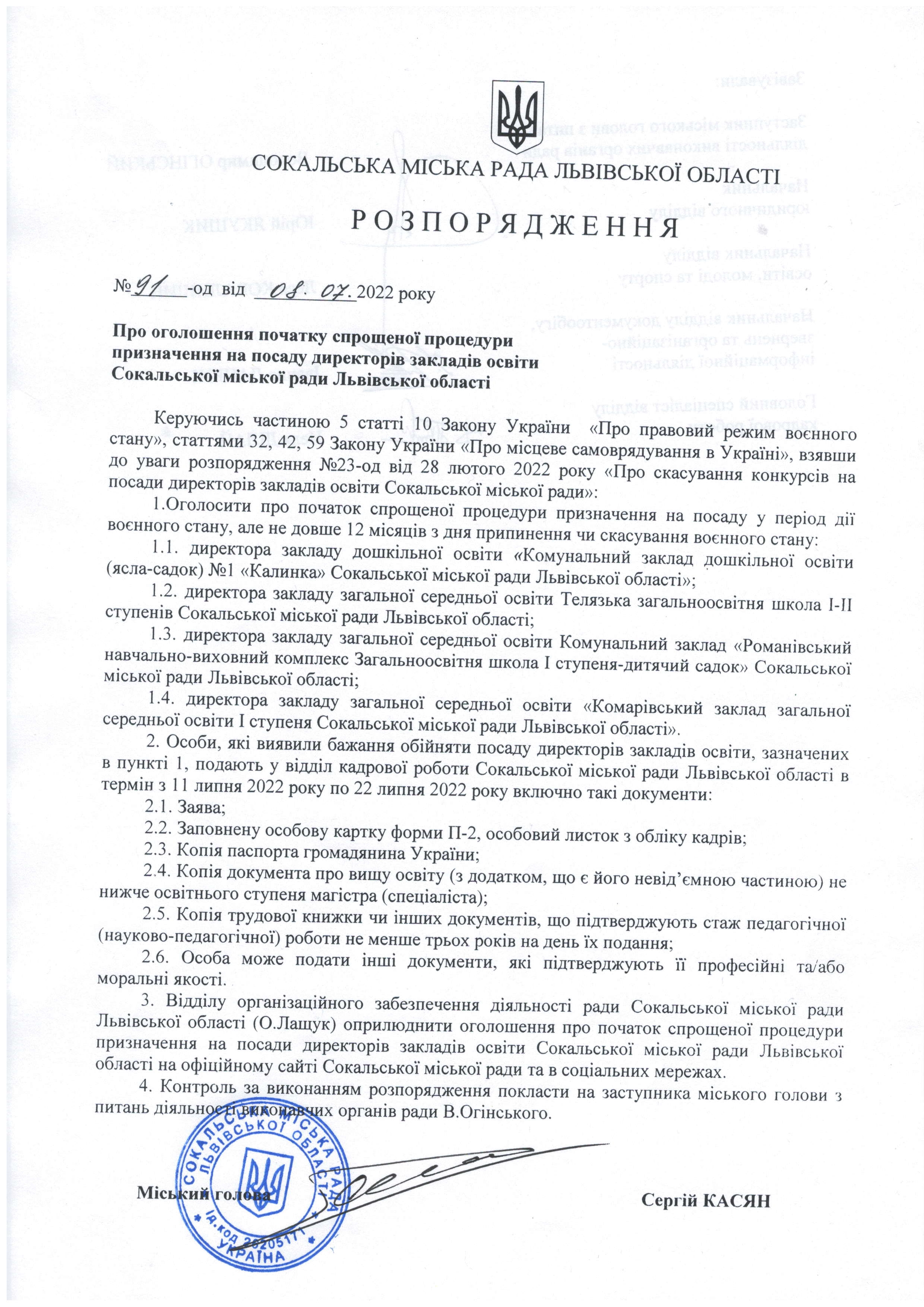 Розпорядження Про оголошення початку спрощеної процедури призначення на посаду директорів закладів освіти